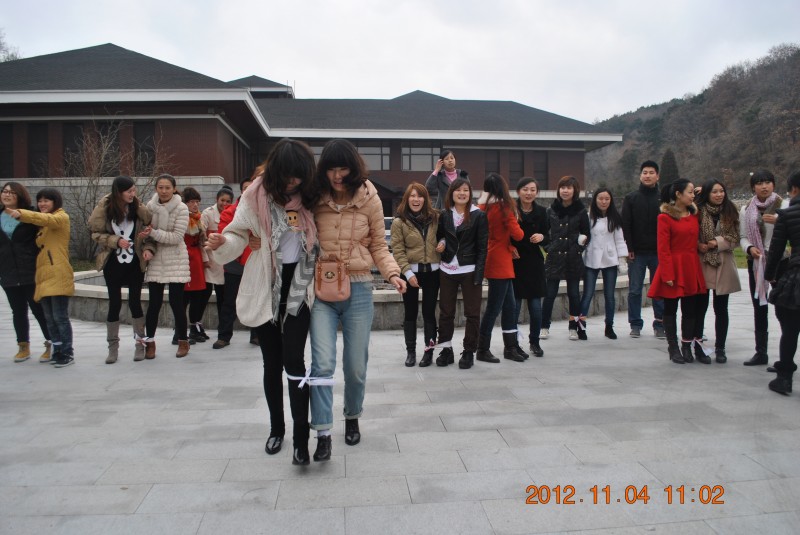 下車后我們立刻排好隊形照了一張合影,隨后便開始了我們的第一項娛樂活動——《兩人三足》,由于大家是第一次玩這個游戲,所以當王石伙伴剛剛分完組,宣讀完規則之后,大家便迫不及待的開始了練習,忙的不亦樂乎,這讓我想起了我們北京影響力的九大理念之——成功是因為態度,只有做任何的事情都端正我們的態度,積極參與,我們才能取得最好的成績。